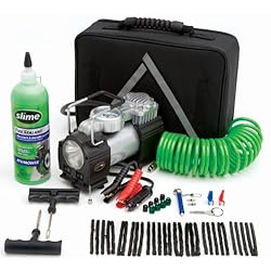 The 12v pump in the kit pumps very fast and is probably the best 12v inflator that I have come across. Comes with everything you need to plug a tire, and a large container of wonderful slime. Also has a long hose with quick connects and the case is really nice. The only thing that is bad about this kit is the air gauge. It is really cheaply made. It has a very cool LED thing at the bottom that lights it up but the plastic holding it on is very small and it was broken off on arival. There are also tools to take out the air valves etc..