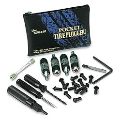 - Pocket Tire Plugger with CO2 contains all the above plus four 16g canisters of CO2 gas and a 4 flexible adapter with solid brass fittings for the most effective repair possible without dismounting your tubeless tire; kit comes in a 5 x 71/2 x 1 zippered pouch; total weight only 18 oz.